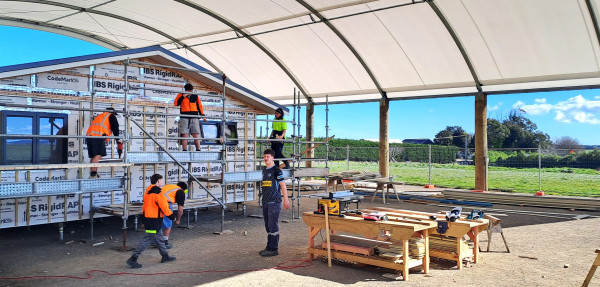 The 14 trainee carpenters are the first cohort on a project of Ōkahu Inuāwai hapū of Ngāruahine Iwi in South Taranaki near Hawera. The first whare under construction at Tokaora - when completed in November – will be transported to iwi land nearby Okaiawa.
